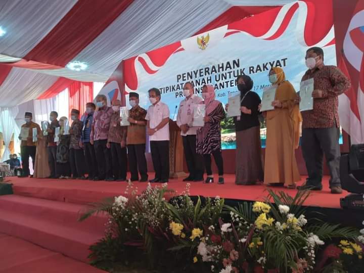 smartdesadigital.id,- Penyerahan sertipikat tanah untuk rakyat oleh Dr. Sofyan A Djalil, SH, MA, MALD (Menteri Agraria dan Tata Ruang/ Kepala Pertahanan Nasional) berlangsung di SMKN 10 Kabupaten Tangerang Desa Babakan Asem Kecamatan Teluknaga, Sebanyak 205 orang telah menerima sertipikat tersebut.